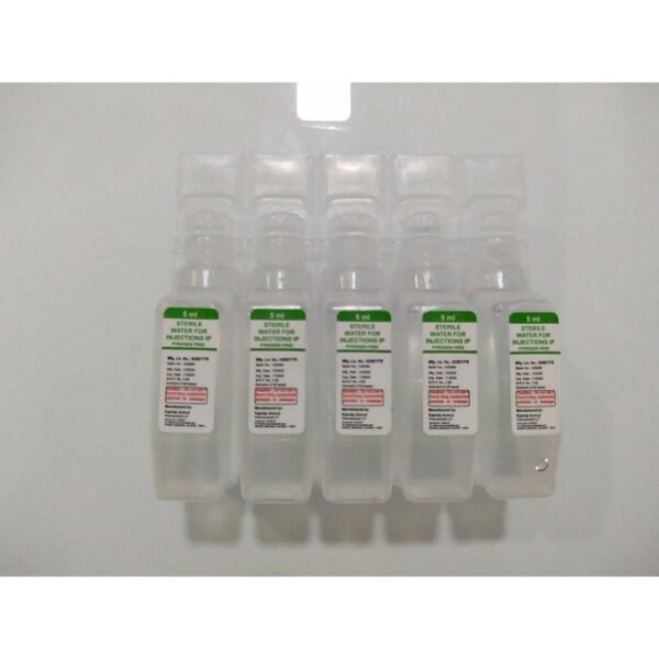 Water For Inj 5ml is a medicine consisting of Sterile Water. It is a clear, colorless, and sterile solution that is intended for injection use. Sterile Water is purified and treated to remove impurities and microorganisms, making it safe for medical purposes. Water For Inj 5ml is commonly used for diluting medications, reconstituting powdered drugs, and for intravenous administration, where sterile water is required. It can also be used for wound irrigation and as a vehicle for reagents used in diagnostic tests. This product is provided in a convenient 5ml vial, ensuring accurate measurement and easy administration. It is manufactured under strict quality control guidelines to ensure safety and effectiveness. Water For Inj 5ml is an essential medicine used in various medical settings and procedures to maintain sterility and deliver medications safely.